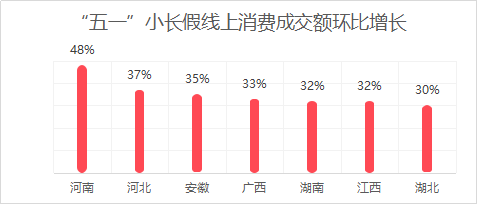“五一”小长假尤其对河南、河北、安徽等中部省份的线上消费拉动作用更强。由于一线城市的线上消费趋于日常化,人们多外出活动,用亲近大自然、户外活动的方式度过假日。同时,一部分在大城市里工作的人员也在假日返回老家,带动了中部省份的线上消费。