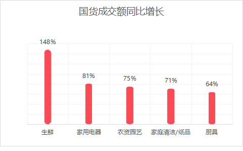 “五一”小长假期间,国产商品的成交额同比增长了52%。国产的生鲜产品十分丰富,农产品触网利用信息经济快速的将地方市场转化为全国市场,成交额同比增长了148%。此外,国产的家电、农资园艺、清洁用品及厨具的成交额同比增长较高。