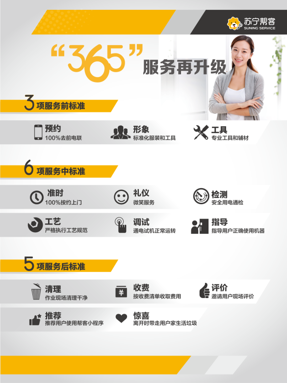 “三分产品七分安装”,超60万套空调,如何保障快速及时的安装?苏宁帮客负责人告诉记者,苏宁全国区域空调售后服务坚持货到24小时上门安装的服务时效,并按照用户预约时间准时上门。不仅如此,全国苏宁帮客空调安装服务统一坚持365服务标准,覆盖作业前、中、后期的工服、工牌、鞋套、垫机布、收费标准、卫生维护等多项标准,并欢迎用户监督。