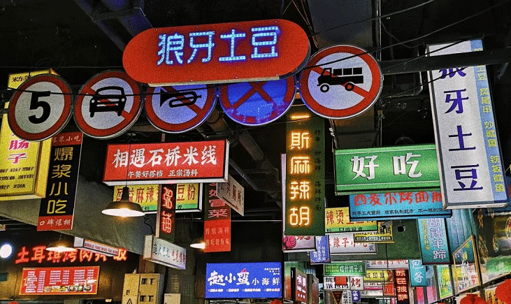 负一楼超市外yes街,统一的灯光亮化,霓虹夜市街景搭配美味食物,遇上“饥肠辘辘”的人群,擦出“狼吞虎咽”的火花。美食是繁荣夜市的永恒主题,品类多样,飘香四溢,定被“吃货”们喜爱。