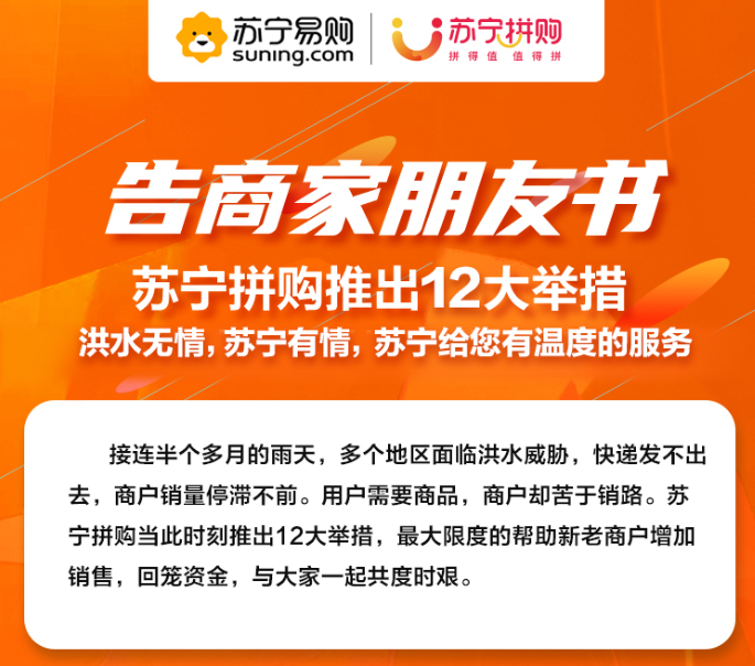 第二,运营扶持。运营针对性帮扶,针对洪灾影响较大的地区商家,苏宁拼购投入专项运营人力,对商家进行针对帮扶。免费经营课程快速上手,拼购提供35节免费的电商在线运营课程,帮助商家全面快速上手。智能客服机器人免费使用,防汛期间,苏宁智能客服机器人免费使用,专属客服迅速响应。免费店铺运营为保障受灾商家店铺运营恢复,服务内容包含1次“店铺诊断”、1个月免费店铺运营。