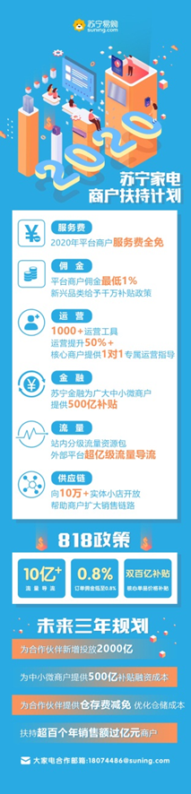 苏宁宣布,2020年苏宁将免收平台商户服务费;平台上的商品供应链会向苏宁生态中10万+实体小店开放,帮助商户扩大销售通路。同时,大家电行业线将持续给平台商户匹配站内外的亿级流量,并通过星河生态赋能平台开放1000+运营工具,针对核心商户提供1对1专属运营指导,借此帮助商户有效提升经营效率,降低运营成本。818期间,平台订单佣金从最低1%降至0.8%,针对核心单品提供双百亿补贴,且向平台商户给予10亿+的流量导流扶持,帮助商户全面应战818。