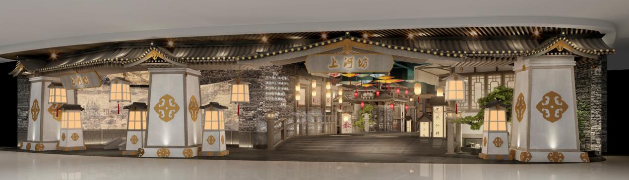 上河坊名称源自于北宋著名画家张择端绘制的不朽杰作《清明上河图》,这幅用高度现实主义手法创作的长卷风俗画,通过对市俗生活的细致描写,生动地再现了北宋汴京升平时期的繁荣景象。整部作品长而不冗,繁而不乱,严密紧凑,有如一气呵成,画卷中大至原野、浩河、商廊,小至舟车人物、摊铺、摆设、市招文字皆统组一起,零售门店与酒肆茶楼交相辉映,真实自然,令人有如临其境之感。而位于宝安大仟里L3层的上河坊主题街区,还将融合古代建筑繁华街景与现代投影科技的结合,力求还原最真实的《清明上河图》中汴河两岸繁华的闹市风景,营造“古街风貌”的场景,融合“美食文化”与“非遗体验”的核心内容,为消费者呈现前所未有的购物体验。