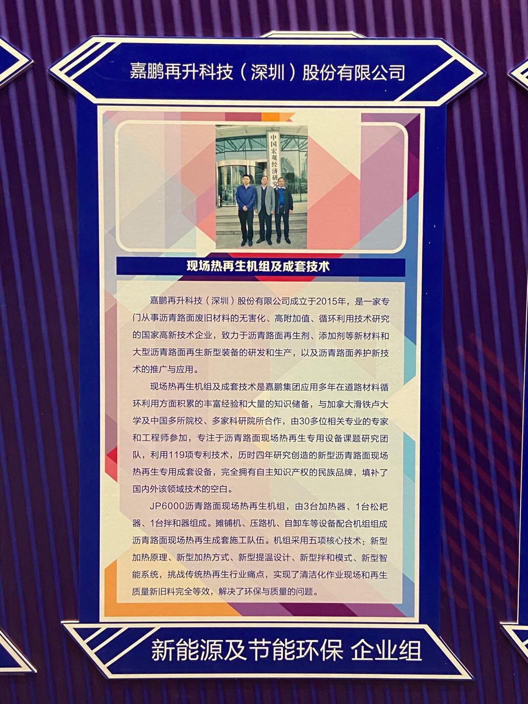 其中嘉鹏再升科技(深圳)股份有限公司“现场热再生机组及成套技术”获得新能源及节能环保行业一等奖,作为企业组代表接受采访。