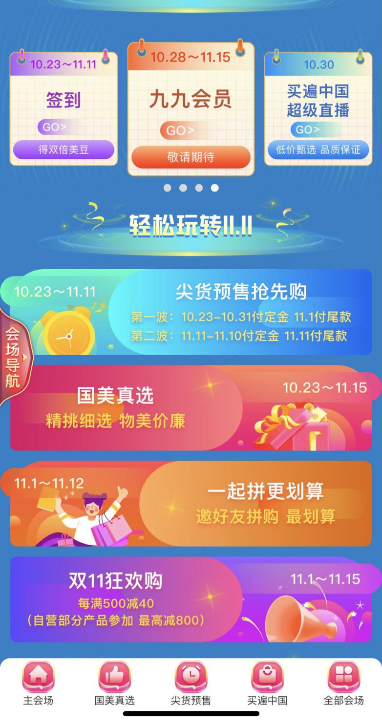 10月28日至11月25日,国美九九会员上线,只需九块九,羊毛就能薅到手;10月30日,“买遍中国”直播杭州站开播,西湖美食便宜还好吃;11月1日-11月3日大促高峰启动,各种红包雨抽奖嗨不停;11月4日至11月6日,万人直播,空前视觉盛宴奉上;11月7日至11月10日,买遍欧洲直播活动,全球好物任你挑;后续还有返场福利等你来拿!