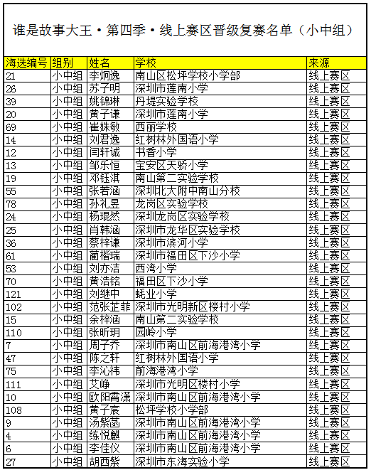 附:“谁是故事大王·第三季”-线上赛区晋级深圳市复赛名单