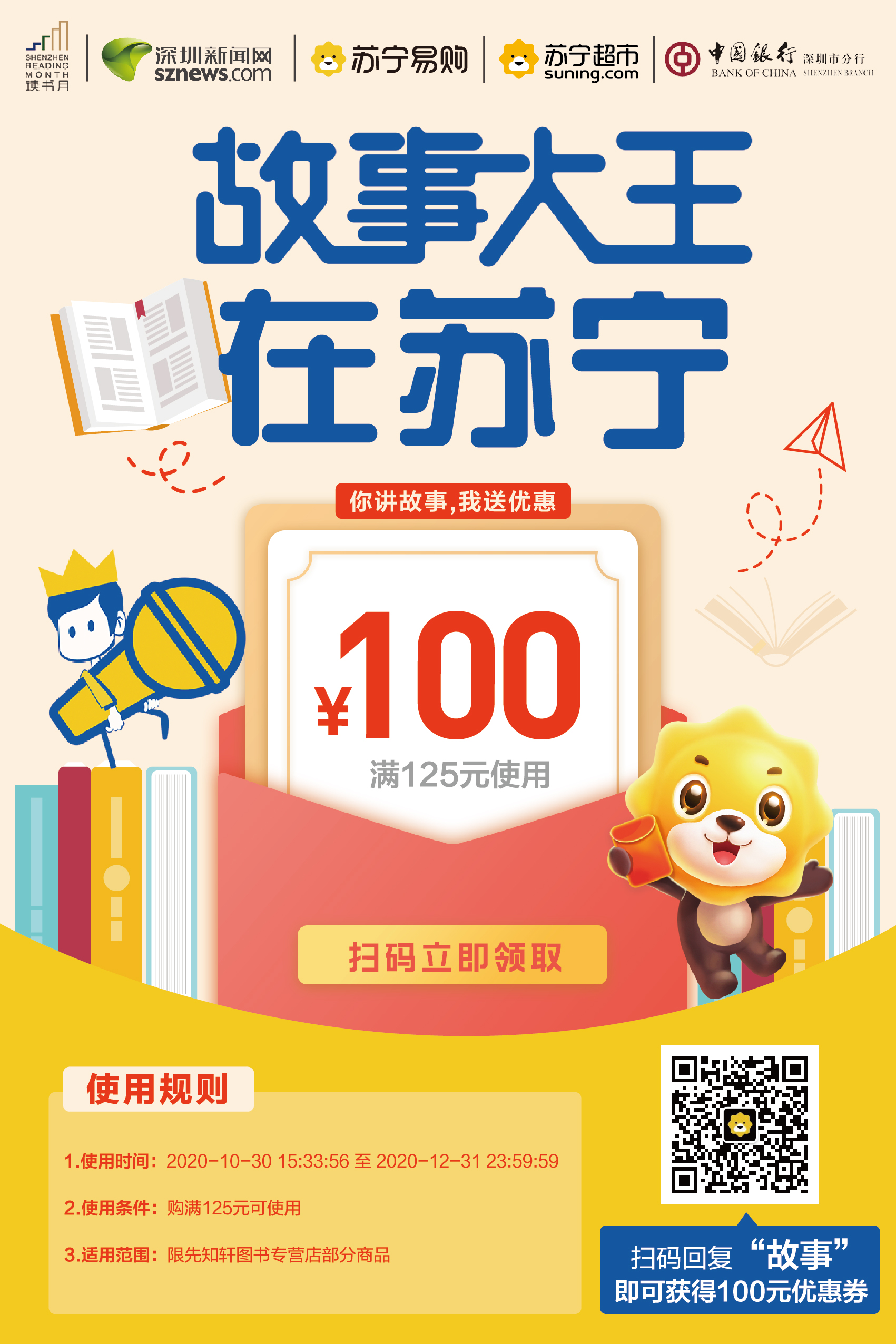 据了解,2020年10月30日至12月31日凡是参与到“谁是故事大王·第四季”的选手扫码关注苏宁易购微信公众号,回复“故事”即可领取100元图书代金券,满125元即可在苏宁易购先知轩图书专营店购买部分图书。