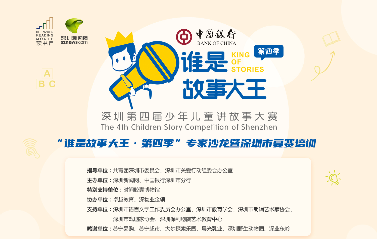 “谁是故事大王·第四季”专家沙龙暨深圳市复赛培将于12月6日(周日)下午2:00——5:00在深圳商报大厦九楼·圆桌会议室举行。欢迎谁是故事大王·第四季·参赛选手前来参与,点击此篇文章《通知!“谁是故事大王·第四季”专家沙龙暨深圳市复赛培训》并文末留言:孩子名字+报名,即可参与报名。