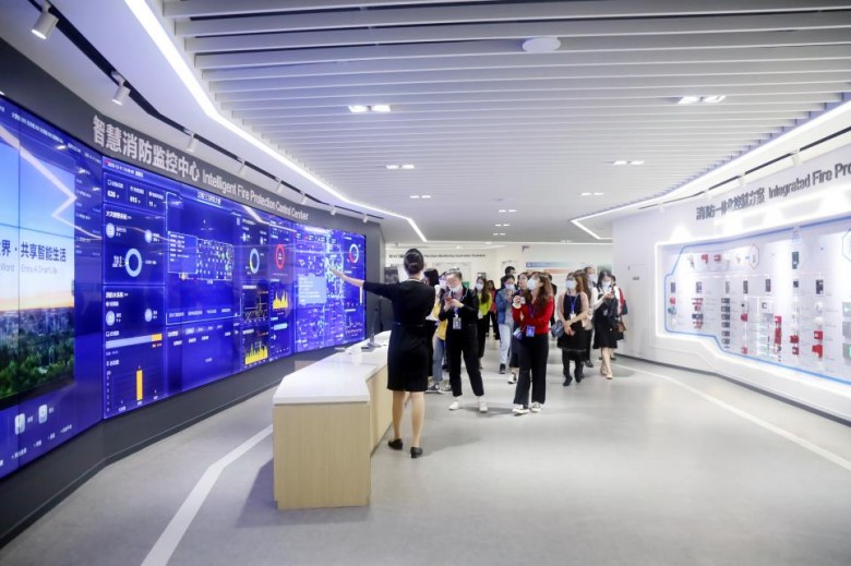 在展厅讲解员的带领下,到访者首先参观了泛海三江的企业展厅,对泛海三江的企业发展历程及整体业务情况作基础的了解与认识。作为深圳市高新技术产业协会的会员单位之一,泛海三江创立于1985年,是中国现代消防电子体系创始企业之一,先后被主管部门认定为“消防与应急救援国家工程实验室”共建单位、“广东省消防与应急救援工程技术研究中心”、“南山区智能消防工程技术研究中心”等。