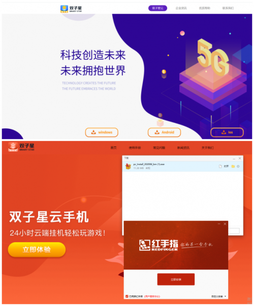 上图为双子星云手机官网,下图为红手指仿照双子星的官网