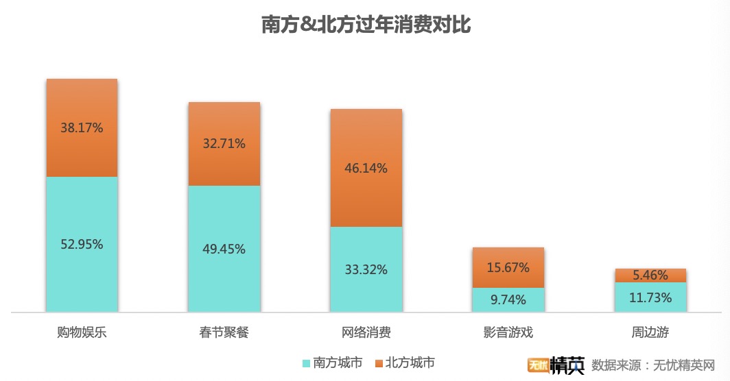 由于春节期间各地防疫情况不同,南北区域差异也比较大。在针对这些原地过年的上班族生活区域的消费调研,数据呈现出明显的差别。相较于春节前的疫情低风险的南方城市,过年期间北方城市的上班族在外出消费上更为保守,与南方城市呈现出明显此消彼长的态势。春节聚餐、娱乐购物以接近15%的数据全面低于南方城市,网络消费则高出13%,影音游戏与周边游消费也有明显的差别。
