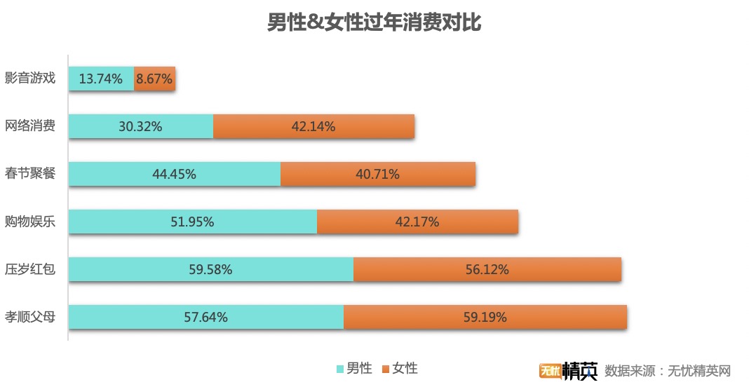 同时为了更好的了解今年的原地过年的消费变化,针对男女消费的差异,我们对调研者进行了深入了解。在今年春节的消费投入上,不论男女,上班族春节的开销基本都在月薪的150%-200%之间,在开销习惯上男女上班族整体比较接近,其中女性孝敬父母的开销比例达到59.19%,比男性略高。春节疫情防控期间减少了非必要外出,网购年货的方式遇上女性偏爱的网购习惯,打折与网店红包,年货、衣服、化妆品、包包等等,买买买简直停不下手,使得这部分的支出占春节开销的首位,并且还比男性高出约12%。同时春节期间电影票涨价,手机与网络游戏更是老套路在春节期间推出各种氪金活动与商品,比如王者荣耀一款皮肤价格在77块到177块之间,春节期间一口气推出了近十套皮肤,让原地过年的宅男宅女们又多了一笔不菲开销。而男性在游戏上的痴迷度与投入一项都会高于女性,春节期间影音游戏的支出高出了女性约6%点。