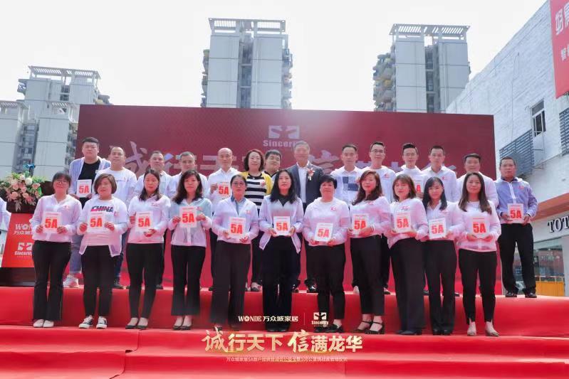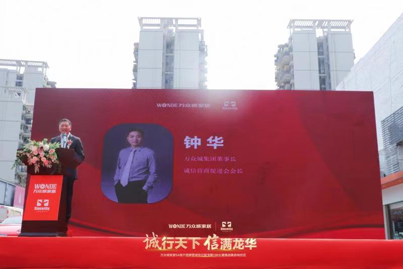 仪式上,诚商会创会会长、万众城集团董事长钟华致欢迎辞,他说,万众城集团自2009年开始做诚信建设,创立了“诚信基金”“诚信沙龙”“5A级诚信商户评选”三板斧,将商户有效投诉从十二年前的91起,商户自觉诚信经营,往后每年未超过5起。万众城既是诚信建设者,也是受益者,投诉率和理赔率逐年下降,商家营业额逐年上升。经过严格的筛选和评审,万众城家居评出了2020年度5A商户共346户,并在当天的仪式上给20名5A商户代表授牌。
