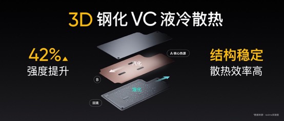 真我GT的性能表现,离不开优秀散热技术的强力支持,创新的3D钢化液冷散热不乏好评。作为GT系列战略成员,真我GT Neo继承了GT系列的强悍基因,同样搭载3D钢化VC液冷散热。创新的3D钢化VC液冷散热不仅大幅度提高了均热板的强度,同时内部的结构优化也让整体的散热效率进一步提升。配合100%覆盖核心发热源的多重立体散热系统,高性能的同时保持冷静。