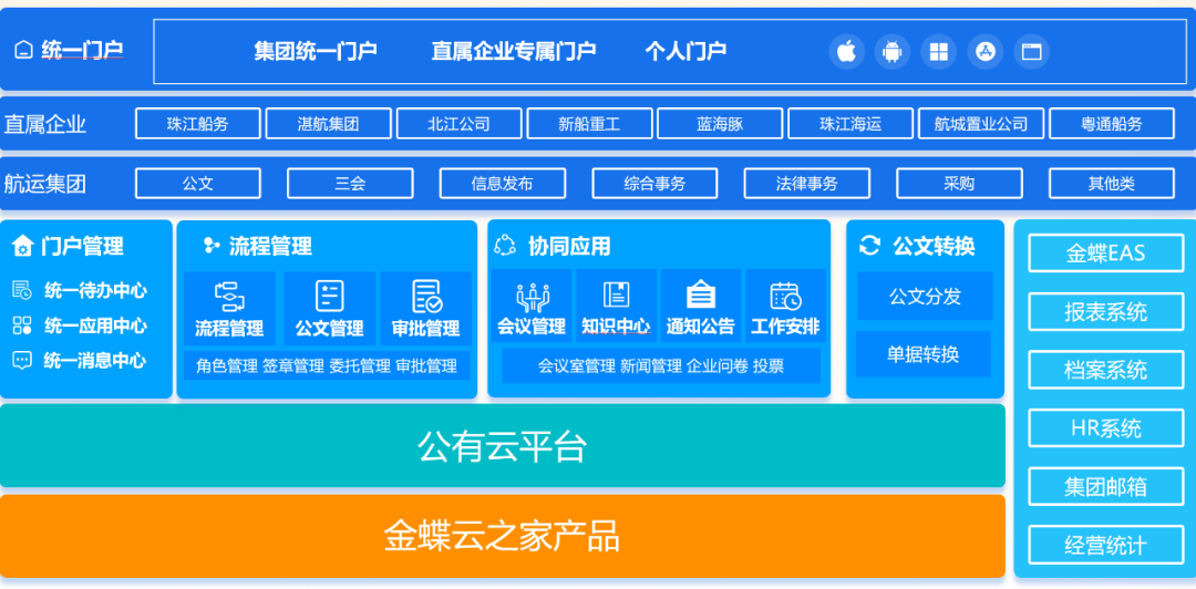 作为大型综合性国企,广东航运集团现有直属企业8家,拥有全资、控股、参股及代理水路客运港口13家,经营和管理96艘粤港澳高速客船。伴随经营规模的发展、技术迭代、应用场景深入,其信息化需要一个可以覆盖集团协同应用场景的综合办公平台,而集团原有的OA已经无法满足航运的持续发展需要。