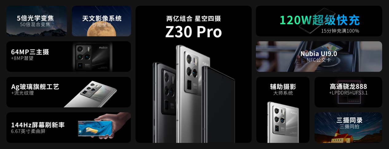 努比亚Z30 Pro将用户需求与行业最前沿科技充分结合,打造无短板顶尖配置:搭载高通骁龙888+LPDDR5+UFS3.1顶尖性能铁三角及行业最高的2亿像素四摄组合全主摄影像系统,独占影像旗舰中最强的120W超级快充与144 Hz超高刷新率,并将全新升级的UI交互系统和更加强悍易用的影像功能融于一身,贯彻科技、艺术与用户需求完美融合的平衡之道。全新一代努比亚Z系列旗舰——Z30 Pro携星光而来。
