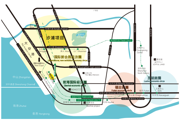 满京华沙浦项目在地理位置上占据非常大的优势,坐落于松岗门户之上,背靠深圳国际机场,世界级的交通枢纽,链接全球。紧邻107国道、松福大道,汇集南光、龙大、广深、沿江高速、虎门大桥和深中通道(规划)等多条城市主干道,川流不息,快速通达宝安、南山、福田等区域,实现客群共享。距离地铁11号线松岗站1.5km,6号线溪头站900m,以及无缝连接未来的26号线,多条公交线途径于此,汇通四方。