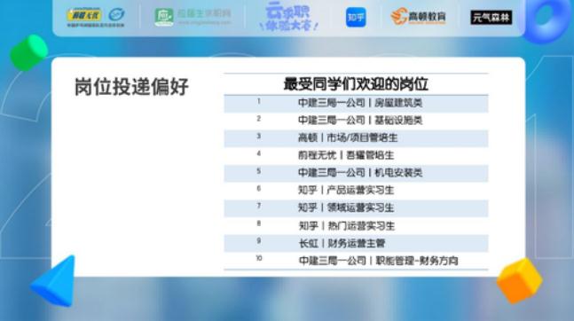 这一点在本次大赛中,也得到了很好的证明,10家企业提供的54个岗位中,投递量最高的10个职位分别来自中建三局一公司、知乎,另外高顿及前程无忧的管培生分别排在第三、第四,不难发现,国企、管培、互联网对当代大学生来说,更具备吸引力~