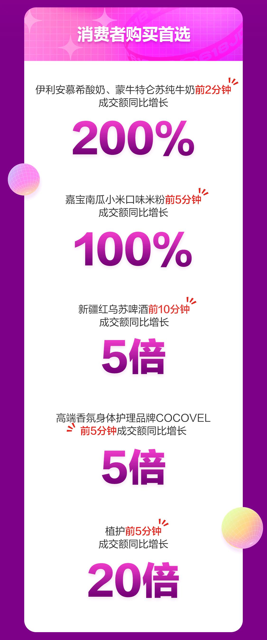 6月18日开场前5分钟,食品知名品牌增势明显。蒙牛前5分钟成交额同比增长超200%,福临门前10分钟成交额同比增长112%,伊利前5分钟成交额同比增长超200%,其中伊利安慕希酸奶、蒙牛特仑苏纯牛奶两款爆品前2分钟成交额同比增长200%。