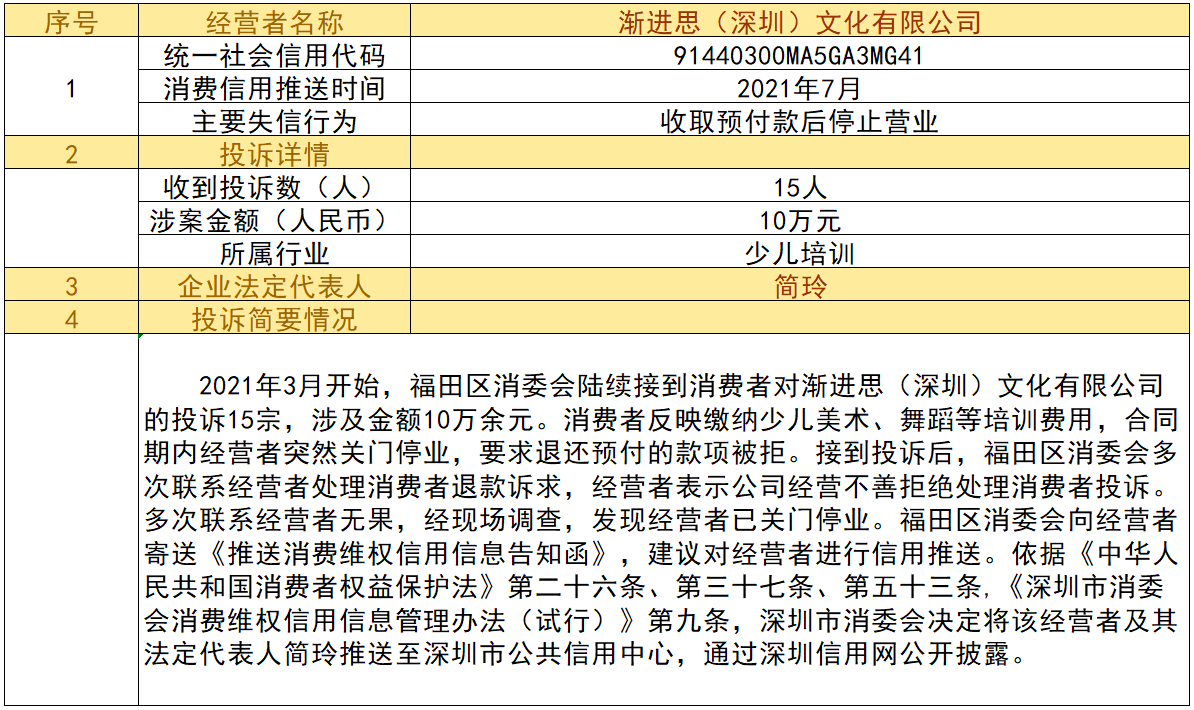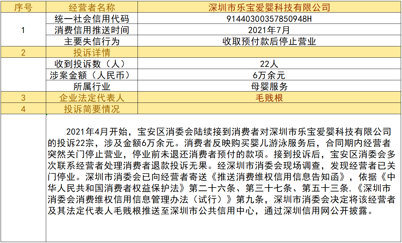 近日,深圳市消委会将九家“跑路”、未按约定退还消费者预付款项的经营者及其主要负责人推送至深圳市公共信用中心,失信经营者信息信息将通过深圳信用网公开披露。