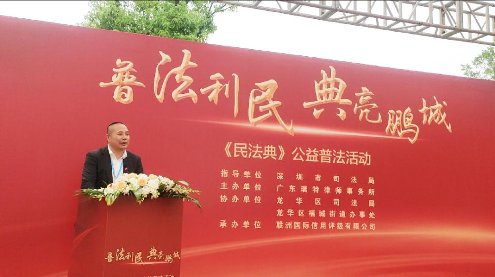 读特客户端·深圳新闻网2021年7月29日讯 (记者 常军平) 昨日,由深圳市司法局指导、广东瑞特律师事务所主办、龙华区司法局、龙华区福城街道办事处、深圳潮青会协办、联洲国际信用评级有限公司承办的“普法利民,典亮鹏城”《民法典》公益普法活动在龙华举行。