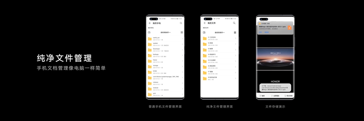 为了帮助事务繁多的商务人士更高效管理个人事务,荣耀还与各办公平台合作,让用户在钉钉、飞书、Welink、WPS办公平台的日程均能通过荣耀Magic3系列进行统一管理。而新增的纯净文件管理系统(此功能后续通过 OTA升级支持),则使荣耀Magic3系列在文件保存和管理方面进行进一步简化,让手机文件管理从此可以像电脑一样简单便捷。
