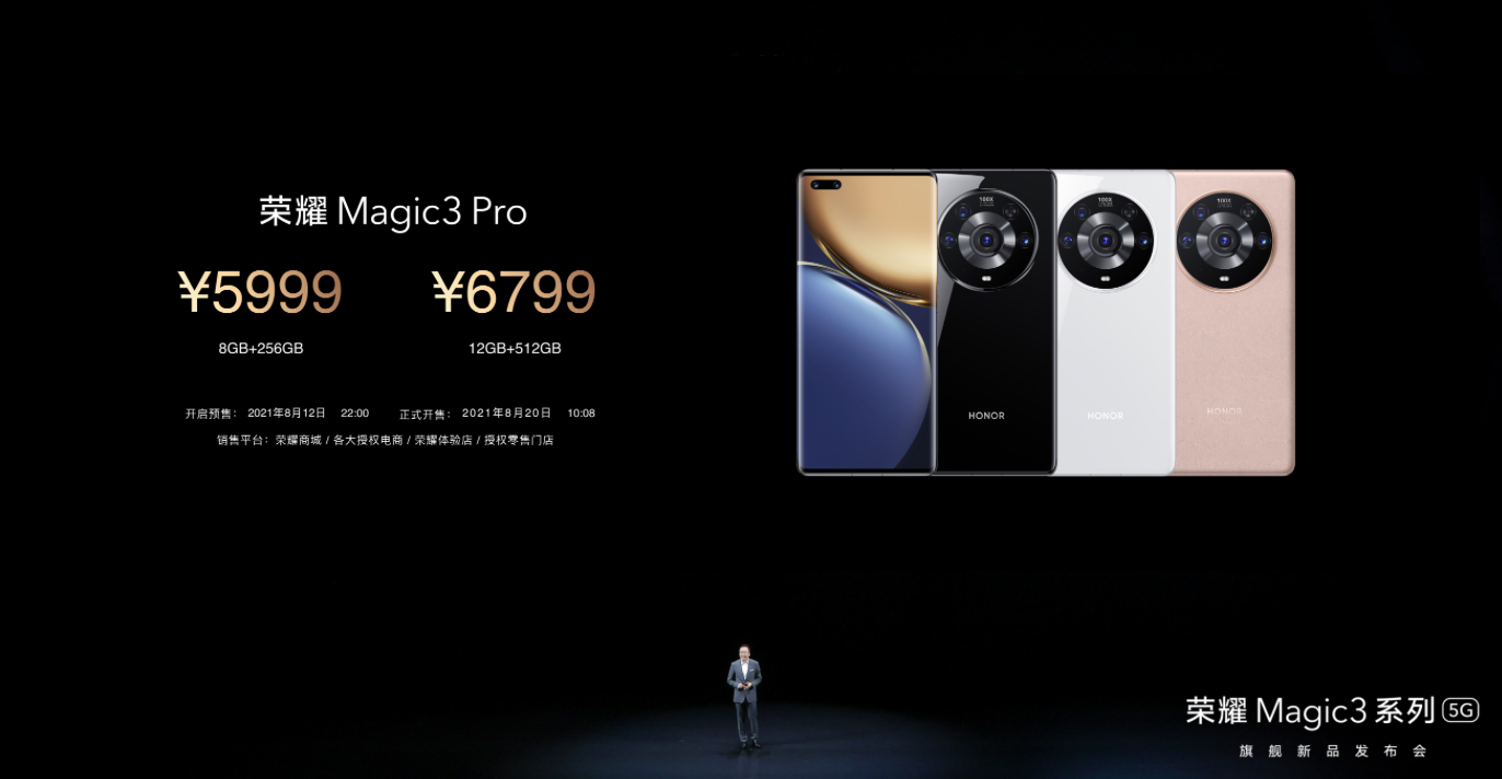荣耀 M agic38GB+128GB版售价4599元,8GB+256GB版售价4999元;荣耀Magic3 Pro8GB+256GB版售价5999元,12GB+512GB版售价6799元;荣耀Magic3至臻版12GB+512GB售价7999元。8月12日22:00荣耀 Magic3系列手机正式开启预售,8月20日10点08分,荣耀 M agic3系列手机将于荣耀商城、各大授权电商、荣耀体验店、荣耀零售门店等全平台开售。