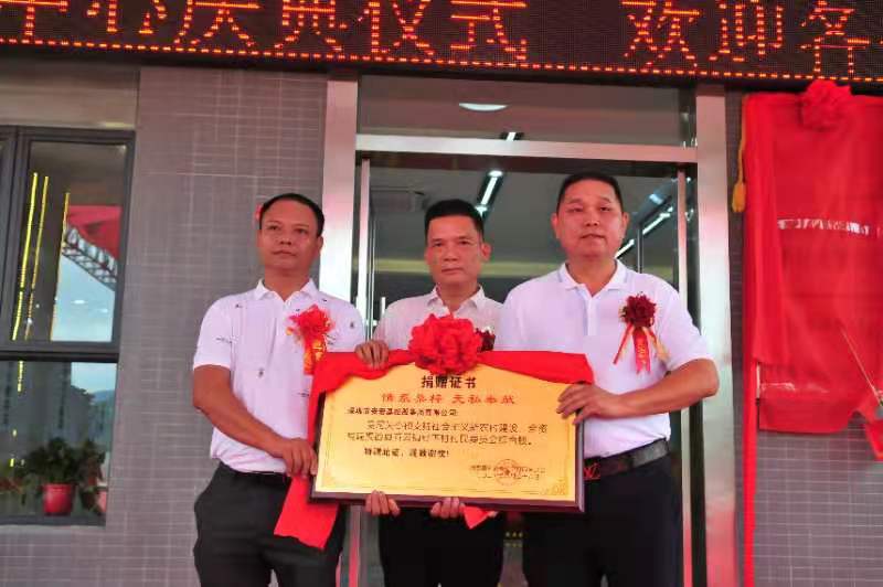 在落成典礼中,深圳安宏基控股集团有限公司彭康辉董事将大楼办公钥匙移交给硁下村党支部书记彭志康。村支书彭志康、五云镇慈善会会长彭志响一起赠牌匾给深圳安宏基控股集团有限公司彭康辉董事。