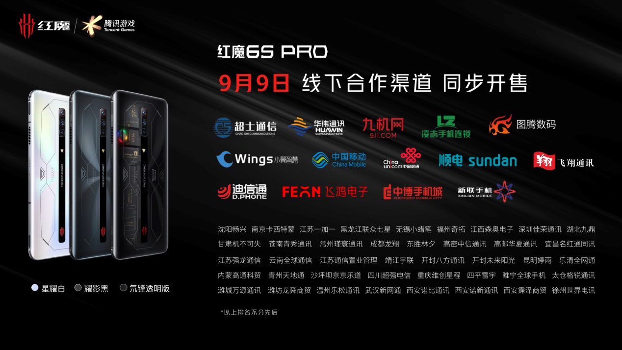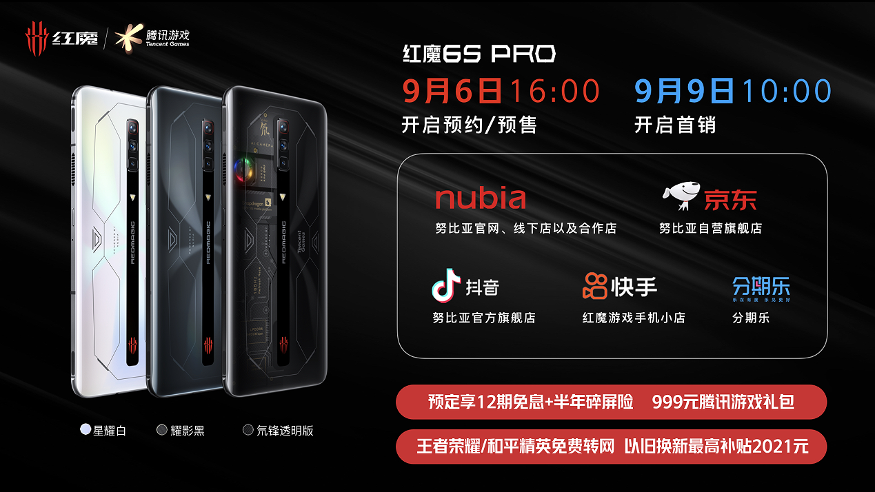红魔6S Pro目前已在努比亚官网,努比亚京东自营旗舰店开启预售,9月9日上午10点全国线上线下渠道同步开售!现在预定享12期免息并赠送半年碎屏险,购机尊享价值999元的腾讯游戏礼包、王者荣耀/和平精英免费转网资格,以旧换新最高补贴2021元。