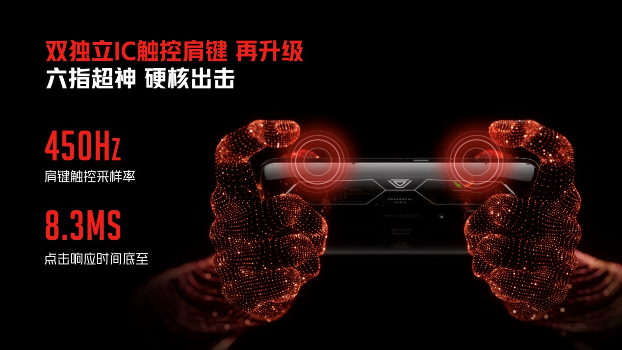 将“肩键”带入手机的红魔本次采用响应速度最快的450Hz触控双肩键,新增500Hz触控腰键,为玩家解锁更多游戏新姿势,全新的触控游戏体验拓展了手机游戏的可玩性,丰富的自定义设置和手势让玩家可以不同习惯进行游戏,小白双指即可玩出高端操作,大神六指成就极限超神。