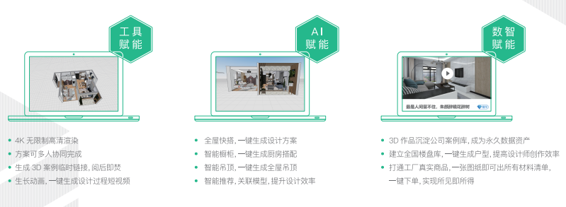 利用全屋快搭智能算法技术,8min内即可完成整屋设计,应用准确率高达90%。过去设计师使用3Dmax软件需要一天来完成的工作,现在通过空间智能布局的AI算法,设计师能快速应用样板间案例,套用专业灯光师结合AI技术制作的万能灯光模板,实现快速出图。