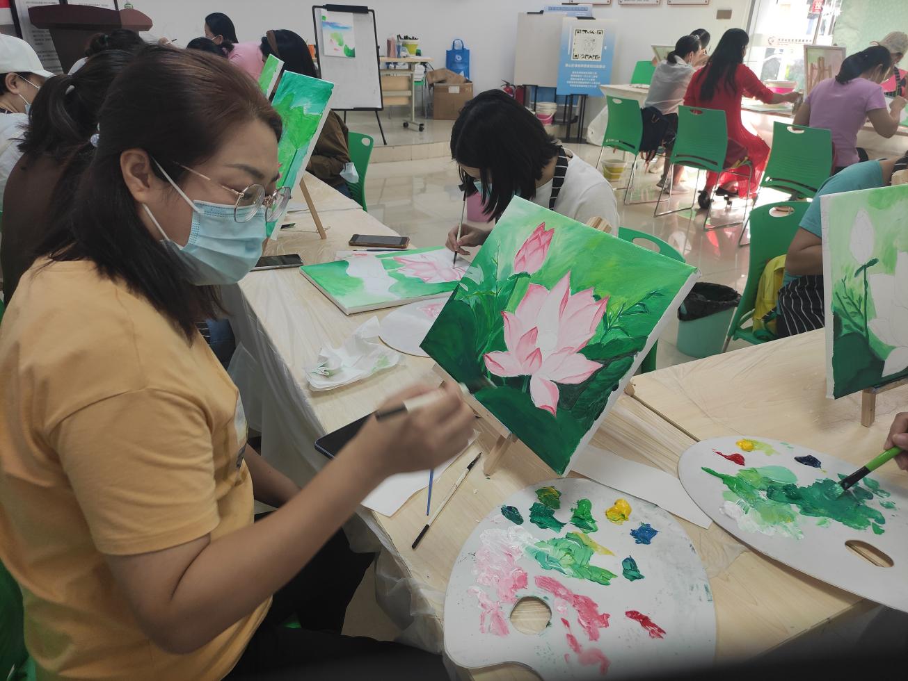 全职妈妈,这个平凡而伟大的群体,操持家务、陪伴孩子、全年无休,为此牺牲了自己的兴趣爱好,交际圈、经济收入。大汪山社区关注妈妈身心健康,以“油画”搭建平台,为全职妈妈们创造减压、专注、有趣的“个人时间”。在这里,妈妈们暂时放下孩子的作业、未洗的衣服、未做的晚饭,专注于和画笔、颜料、画友相处的时间:油画基础、画面结构、色彩调配、色彩层次……