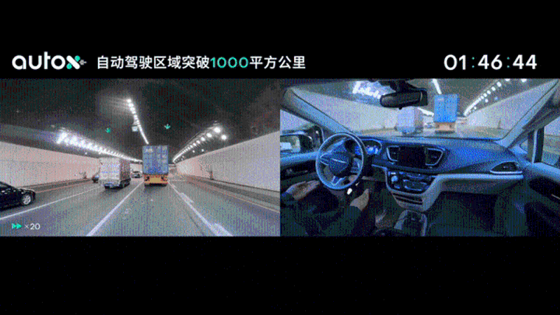 此外,无人车还穿越了长达2.3公里隧道。在1小时46秒进入隧道后,AutoX无人车始终保持50-60公里高速时速,连续穿越三个隧道,最终平稳驶出,定位算法轻松应对数公里长的隧道。