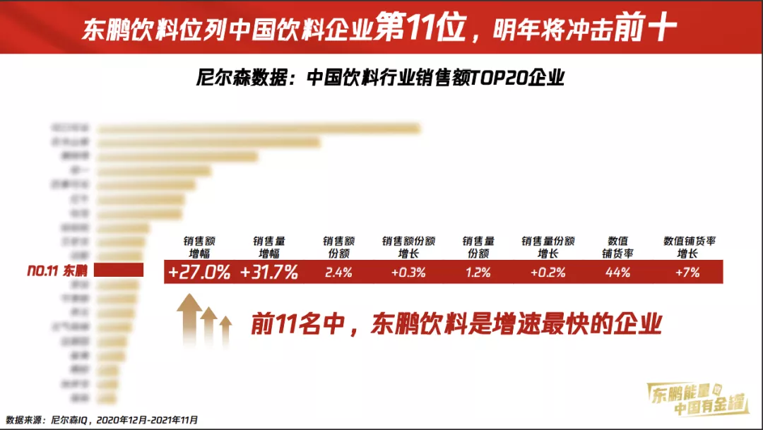 尼尔森数据显示:从整个中国饮料行业销售额TOP20的企业排行榜来看,东鹏饮料以27%的年增幅,成为增速最快的企业,排名也从前一年的第14名,跃升至第11名,2022年将冲击前十名。大单品500ml东鹏特饮,也成为中国饮料单品第11名,较去年上升5位,是前20名中销售额增速最快的单品,达48%。