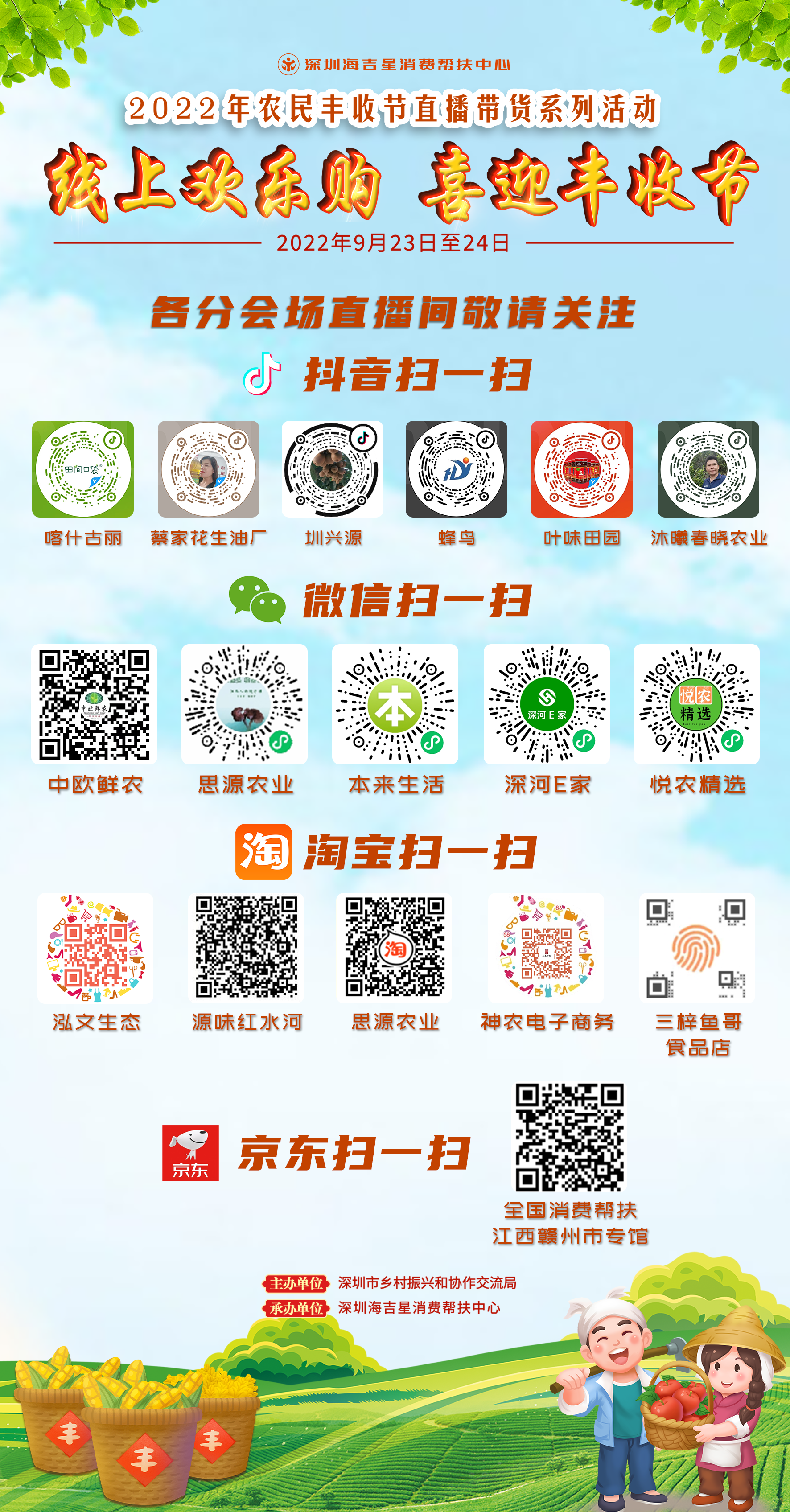 读特客户端•深圳新闻网2022年9月22日讯 (记者 牛耘)秋风起,丰收忙。9月23日将迎来秋分节气,同时也将迎来第五个“中国农民丰收节”。9月23日-24日,由深圳市乡村振兴和协作交流局主办、深圳市海吉星国际农产品物流管理有限公司(深圳海吉星消费帮扶中心)承办的“线上欢乐购喜迎丰收节”2022年农民丰收节直播带货系列活动,将在深圳海吉星消费帮扶中心举办,各区消费帮扶中心以分会场形式同步开展。