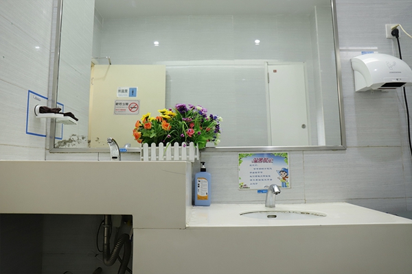 洗手台美观干净,儿童洗手池高度合适,但是水笼头位置过于靠内。