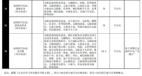 天花板破损。 “厕评行动”的第一站,检查组来到西乡街道恒生医院,检查的公厕位于急诊楼一楼厕门旁,这是一间社会公厕。检查组从正门进来没有发现明显公厕指引,公厕外墙上贴有“卫生间保洁签到表”,但清洁记录不规范,清洁时间安排不合理,晚上没有安排清扫保洁及清洁内容不全面。设有工具房,但劳保工具及杂物在公厕内随意丢放,天花严重破损,男厕内的排气扇处于快要脱落状态,存在安全隐患,公厕内通风不足,异味十分浓重,男女厕内设有洗手台,提供免费的纸巾和洗手液,但未设儿童洗手台及婴儿护理台,洗手盆内清洁不到位,污渍明显,还有水盆放在洗手台上,仪容镜裸露,厕格内没有搁物架、挂钩等设施。男厕内设有两个小便池,其中一个便池的排污管脱落未修复,地面水迹明显,风干机未开启。 市民代表马信义说,他留意到厕内没有通风和逃生指示灯等,硬件设施滞后。西乡街道执法队员说,虽然医院准备整改,但目前正在使用中,针对不符合规范的地方开具整改通知书,督促医院先进行部分改善。西乡街道执法队员按相关条例规定,现场对其开具了责令整改违法行为通知书,限期1个工作日内整改完毕。最终,这间公厕得分为58.5分。 医院相关负责人说,按照标准,恒生医院所有公厕已列入改造计划,包括各类设施、无障碍通道、管理制度等,设计图纸已完成,今年年底将完成改造。宝安区城管局市容管理中心环卫部副部长陈琼则表示,这间公厕很多细节没做到位,保洁频次不足,管理不到位,硬件设施也不完善,在这方面扣分较多。她希望,医院在日后改造设计时能与主管部门多沟通交流,完善设计,打造真正的好公厕,改造完成后也要在管理上下功夫。 区妇幼保健院获98分,可申报四星级公厕