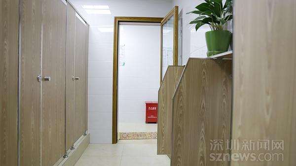 陈琼在检查通风设施,建议安装吊扇。 厕评行动第一站首先来到了福永街道怀德社区党群服务中心公厕。检查人员一进服务中心大厅,顿时眼前一亮,厅内窗明几净,地面光可鉴人,看上去十分洁净。在大厅一角的墙上虽有公厕标识,但不太明显。母婴室内布置温馨,设施齐全。公厕位于母婴室旁边,标志明显。无障碍洗手间空间很大,但没有扶手。女厕内干净整洁无异味。男厕内通风较好,纱窗没有灰尘。无障碍洗手间还是没有扶手。小便池有隔板,有绿植,有文明提示,没有异味。