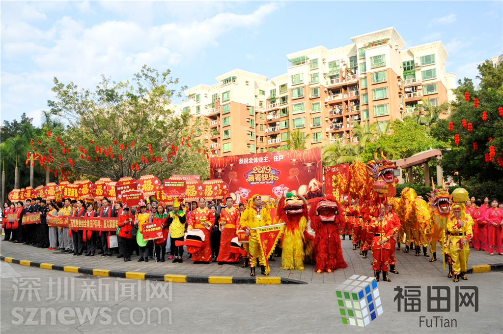 深圳新闻网2月20日讯(记者 黄思凌 通讯员 许小婷)金猪贺岁,新年到,梅林一村传统的巡游大拜年又如约而至。春节期间,梅林一村中央大绿洲舞台成了欢乐的海洋。彩车、财神、金猪、舞龙醒狮、威风锣鼓、秧歌腰鼓齐聚一堂正准备集结出发的梅林一村的新春团拜巡游。 巡游方阵由梅林一村村民、梅林一村义工、梅林一村老年协会、梅林一村管理处员工组成。为了此次大年初一的大巡游,他们已经提前一个多月进行排练了。据介绍,庞大的巡游队伍由装饰得美伦美奂的彩车开道,车上有财神爷坐阵,巡游的途中会给围观的村民送去象征生活甜蜜的贺年糖果。紧跟随后的是:安塞腰鼓和喜庆秧歌方阵、舞龙和醒狮方阵、威风锣鼓方阵、金猪贺年方阵、居民迎春方阵、环保方阵、欢乐员工方阵。 巡游队伍三百多人,每人手里或高举贺年条幅、或手持贺年福气牌、还有应节的喜气对联和彩旗,队伍蔚为壮观,绵延近千米。这支喜庆的团拜巡游队伍浩浩荡荡地从梅林一村中央大绿洲舞台出发,围绕整个梅林一村小区,大声地喊着贺年的祝福口号,给梅林一村留深过年的村民送去了新年最早最诚挚地祝福。 除此之外,巡游队伍更是会在小区各个围合内空地上村民进行年俗表演:气势如虹的威风锣鼓、活灵活现的舞龙表演、精彩绝伦的醒狮献瑞表演。每次表演结束都收获了村民如潮水般热情的掌声和赞叹,让大家惊叹不已的是这般精彩的表演竟不是来自专业队伍而是由管理处员工组成,并在忙碌的工作之余进行排练。 听闻后村民都纷纷点赞和笑称:管理处表演的员工们都可以直接C位出道了。最受家长和大小朋友喜爱,争相拍照合影的是两位卡通财神带领的“十只小金猪”,可爱的小村民穿上小猪佩奇的服装,让大家把新年祝福和红包通通都“佩齐”了。 巡游活动一直持续进行了三个多小时,把梅林一村十三个围合通通巡游了一圈,让每个村民都听到祝福感受了浓浓的年味。据悉,此次梅林一村2019新春万人团拜大巡游活动是梅林街道办事处资助的民生微实事项目,由梅林街道办事处和梅林一村社区工作站主办,万厦社区公共服务中心和梅林一村管理处承办。