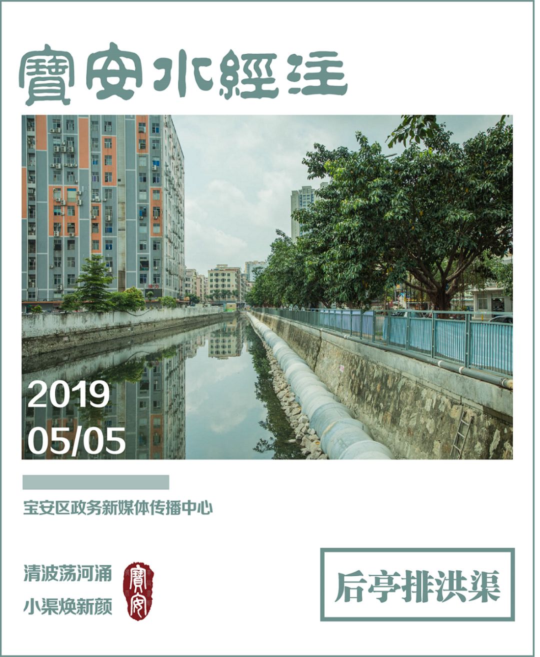 〓后亭排洪渠 〓 后亭排洪渠位于宝安区沙井街道,起点为南亭路与大埔路交汇处,在北亭路由暗渠转为明渠,最终汇入沙井河,属于茅洲河的三级支流。后亭排洪渠全长0.92km,其中北亭路至入沙井河水闸为明渠,明渠段长约0.255km。