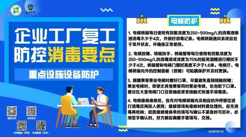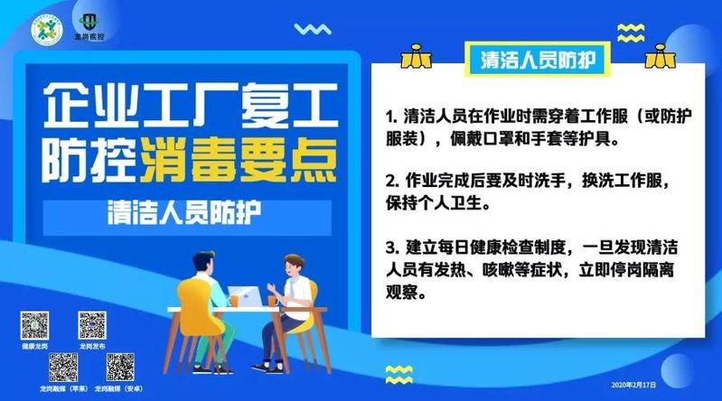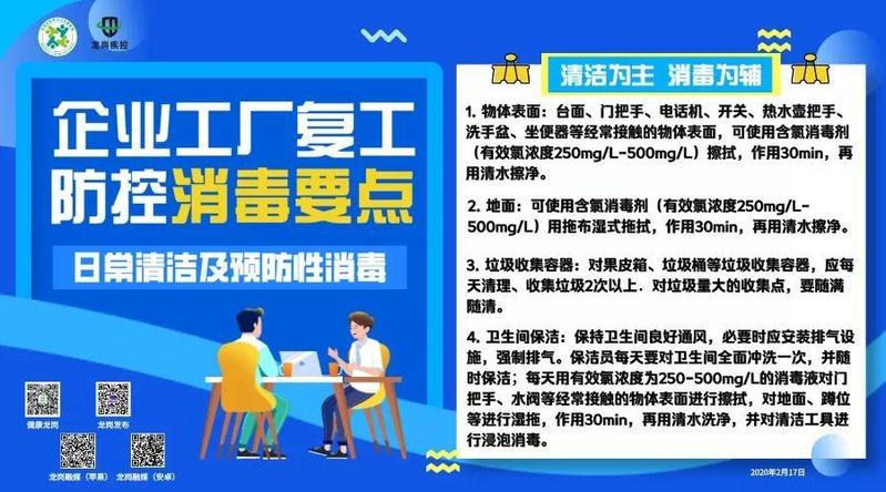 最近 很多人陆陆续续开始上班了 复工后,问题来了 如何做好公共办公区域的消毒? 发布君温馨提示 千万别学网上“自制消毒通道”那一套哦 消毒方式用错了 严重的甚至会危及生命 靠谱的消毒方式 看这里↓↓↓ 企业工厂复工有哪些 防控消毒要点? 四张海报全说清! 大家还可以戳文章底部“阅读原文” 下载海报和视频 在公司或是工厂的电子屏循环播放 让更多人学习     请一定要记住 消毒千万别“踩坑” 01  消毒通道不合用! 不能对着人体喷雾消毒!  用自制的消毒通道消毒,很可能是用生命来进行消毒,用化学剂开展人体喷雾消毒,在杀死病毒的同时,可能也会害惨自己!  对人体进行化学喷雾消毒,吸入消毒剂会导致人体肺部损伤,严重时可出现肺部纤维化。 消毒做得不正确,大家可能会因为消毒剂损伤肺部而得机化性肺炎,甚至危及生命!所以,不要对人体用化学消毒剂喷雾消毒!请拒绝在工业园区建设消毒通道! 02  “大炮消毒”不可取! 不能胡乱消毒!  杀灭新冠病毒,不是所有消毒方式都适用,更不能胡乱消毒!譬如以下这种用“大炮消毒”的方式对环境消毒是不可取的。  环境消毒是一个科学的工作,要根据流行病学指征和(或)病原学监测、传染源排出的病原体及可能污染的范围为依据,来确定开展消毒处理的范围和方式。所以,对外环境的消毒必须经专业人员评估后方可开展。 不得在有人的情景下对空气(空间)使用化学消毒剂消毒,不得使用醇类、季铵盐类、醛类、胍类消毒剂对室内空气消毒。 03  还有这6点一定要记住!  1 无需对室外环境开展大规模的消毒,如使用飞机、无人机、喷洒车、雾炮车等设备对街道、社区、园区、广场、马路、行驶的汽车外表面及车轮等实行大规模喷洒消毒剂(粉)消毒。 2 禁止使用超低容量喷雾器、热烟雾机等对外环境进行空气消毒。 3 不宜直接使用消毒剂(粉)对人员进行消毒,如设置喷雾消毒通道让人员通过,或直接对人员喷洒消毒液。 4 不宜用循环风空气消毒器进行终末消毒。 5 不宜使用戊二醛对环境进行擦拭和喷雾消毒。 6 不宜使用高浓度的含氯消毒剂(有效氯浓度大于1000 mg/L)做预防性消毒。 面对新冠肺炎疫情 请大家一定要保持理智 正确消毒 才能更好地保护自己  点击阅读原文,输入提取码arsz 即可下载文内视频和海报 记得把这份“企业复工消毒指南” 转给更多有需要的人哦~ 抗击疫情,我们在一起 返深车辆及驾乘人员 请扫码登记!  转发给你身边的人让更多人知道 龙岗发布编辑组 来源:健康龙岗 责编:钟海润 二审:陈杨 三审:白甲林      怎么消毒?看这里就知道了