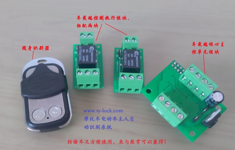 本摩托车电动车主人自动识别系统是为了解决目前摩托车电动车机械电门锁的不安全及不方便使用而进行的一项发明,本发明利用了我专有成熟的电子动态密码技术,实现了不可复制的高安全性。