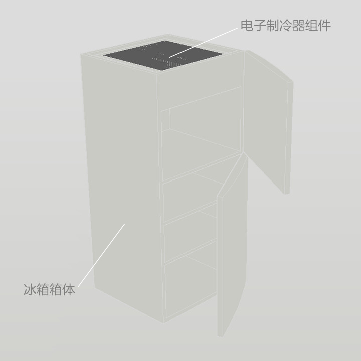 磁制冷冰箱技术核心是安装在冰箱顶部的电子制冷器组件。它由磁热芯体、(围绕在芯体四周的)绝热层体、电磁铁、热二极管模组组成。当通过电磁铁给磁热芯体加上磁场时,磁热芯体放热。这时,热二极管模组一是导热的,热二极管模组二是绝热的,热量通过模组一导出;当电磁铁断电,给磁热芯体加上的磁场去除时,磁热芯体吸热制冷。这时,热二极管模组一是绝热的,热二极管模组二是导热的,这时磁热芯体变成了冰箱的制冷源,通过模组二向冰箱吸热。这个过程循环往复进行,磁热芯体就能够通过热交换,为磁制冷冰箱源源不断地提供冷气。