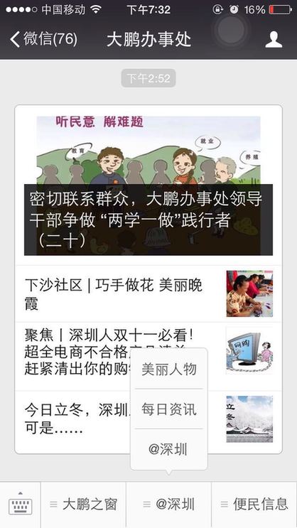 截止到11月7日,大鹏新区已有大鹏先锋、大鹏新区社区家园网、大鹏公共事业、筑梦大鹏、、大鹏办事处等多家政府官方微信公众号入驻了@深圳。
