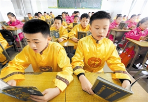据悉,宝龙学校是宝安区第一所民办学校,在校学生绝大多数为劳务工子女。孩子们的父母常常因忙于工作,而忽略了对他们的传统道德教育。“刚学文化知识时不懂得基本礼仪是多数孩子的通病,很多孩子初入社会很难适应。”该校董事长陈宝元表示,学校从上学期开始就从校外引进国学老师,每天教授孩子们诵读国学经典。图为宝龙学校的师生在课前齐诵国学经典。
