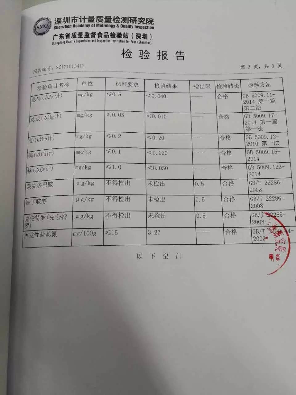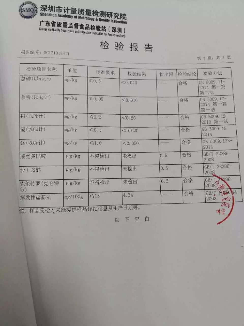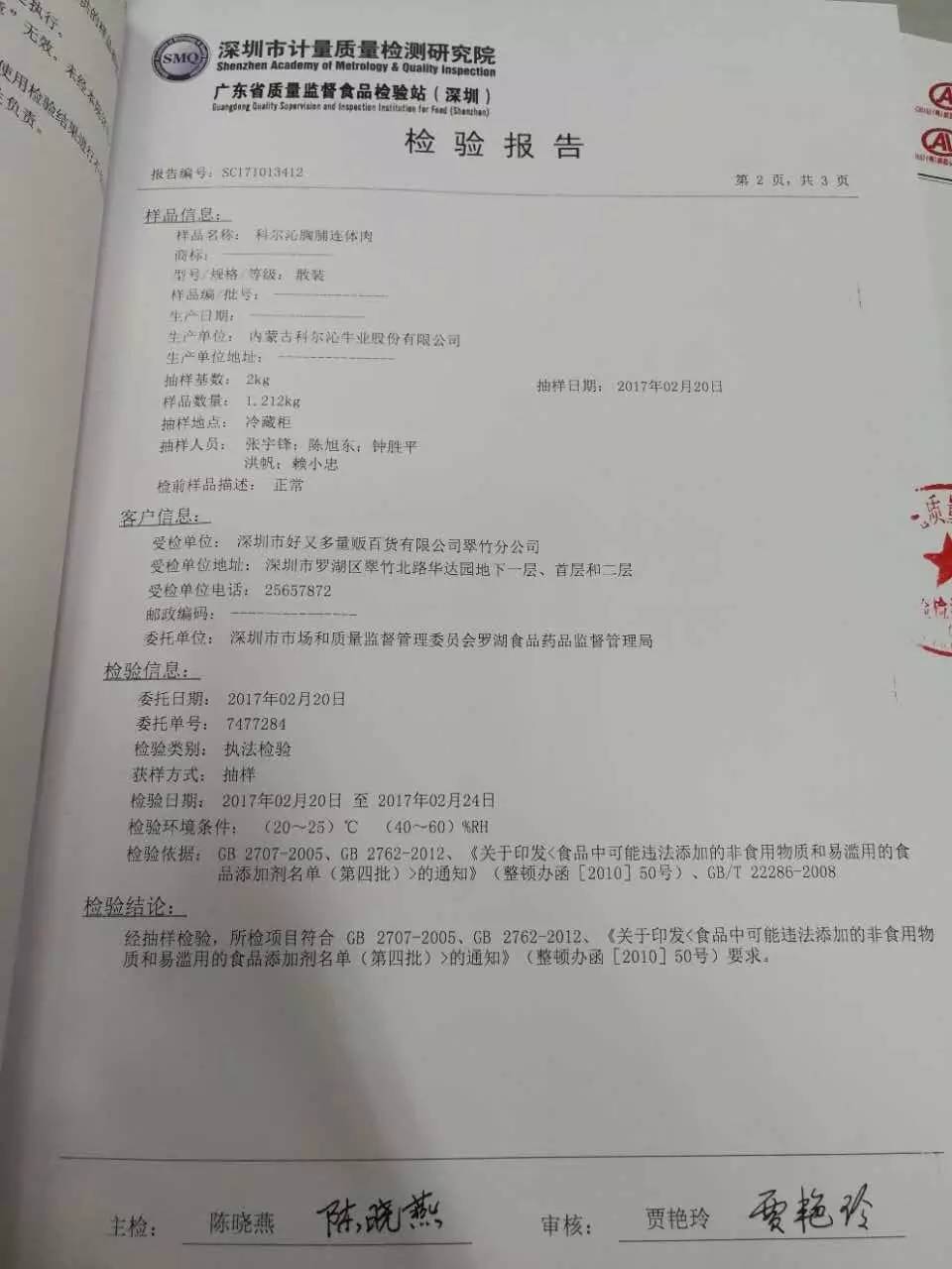 取样的科尔沁牛肉随后被送往深圳市计量质量检测研究院,进行了铅、镉以及瘦肉精等多个指标的定量检测,检测结果显示均合格。