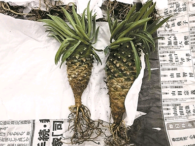这些“小菠萝”只有手掌大小,从外表看很像食用菠萝——主体跟菠萝一样有许多颗粒状突起,并呈螺旋状排列;主体上方长有一些叶片,细长柔软,呈嫩绿色或翠绿色;下方长有人参一样的根系。只不过这些“小菠萝”可比食用菠萝坚硬多了,敲在查验台面上发出清脆响声。