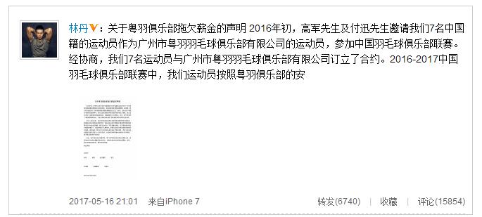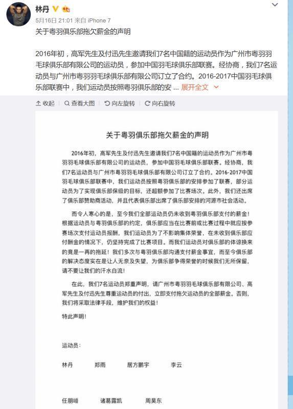 5月16日晚,林丹通过微博发表了与其他6名队员的联合声明,称粤羽俱乐部一再拖延支付薪水,长期沟通无效后,队员们对俱乐部的态度实在是失望和无奈,被迫公开讨薪。并称如果俱乐部不能立即支付所欠薪水,7名队员将动用法律手段。