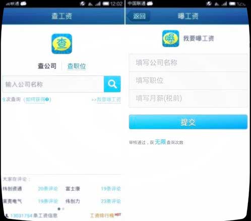 当记者继续查询时,软件提示记者免费查询次数已经用完,不过提醒说在微信或者微博上分享就可以获得10次查询机会。如果选择晒出自己的工资和单位,审核通过后便可获得50次查询机会。为了获取更多的查询机会,记者点击了“曝工资”一栏,随意输入了一份某公司的薪酬信息后,该信息很快就被公布了,记者也获得了50次查询机会。