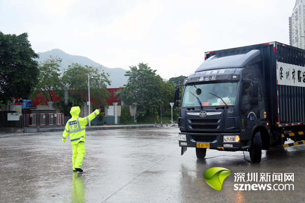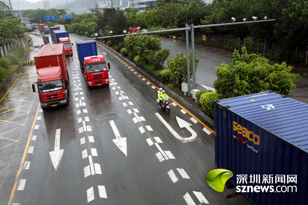 由于交通管制后的明珠立交匝道封闭,所有货柜车均从明珠大道排队进闸。上午10时30分,梧桐山大道、盐田路、明珠道北往南等,相继出现车多缓行现象。在盐田路与明珠大道交汇,记者看到, 10余名身着雨衣的交通协警正冒雨执勤。交警部门表示,为确保进港车辆需按序通行,对于货柜车司机的插队行为,将依法予以处罚,并通知码头中止该车辆在码头相关作业。